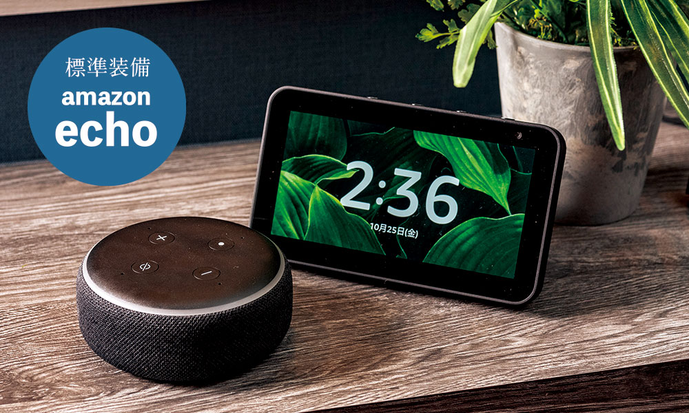 ※スマートスピーカーは、Amazon Echo1台を標準装備しています。スマートスピーカーへの呼びかけ・返答はイメージです。写真の設備は、マンションギャラリーにあるものを撮影しており、実際の物と異なる場合がございます。エアコン・照明・テレビ等の家電、インテリアはオプションです。また、IOT機器の組み合わせや機種によって操作内容が異なります。詳細はスタッフまでお尋ねください。