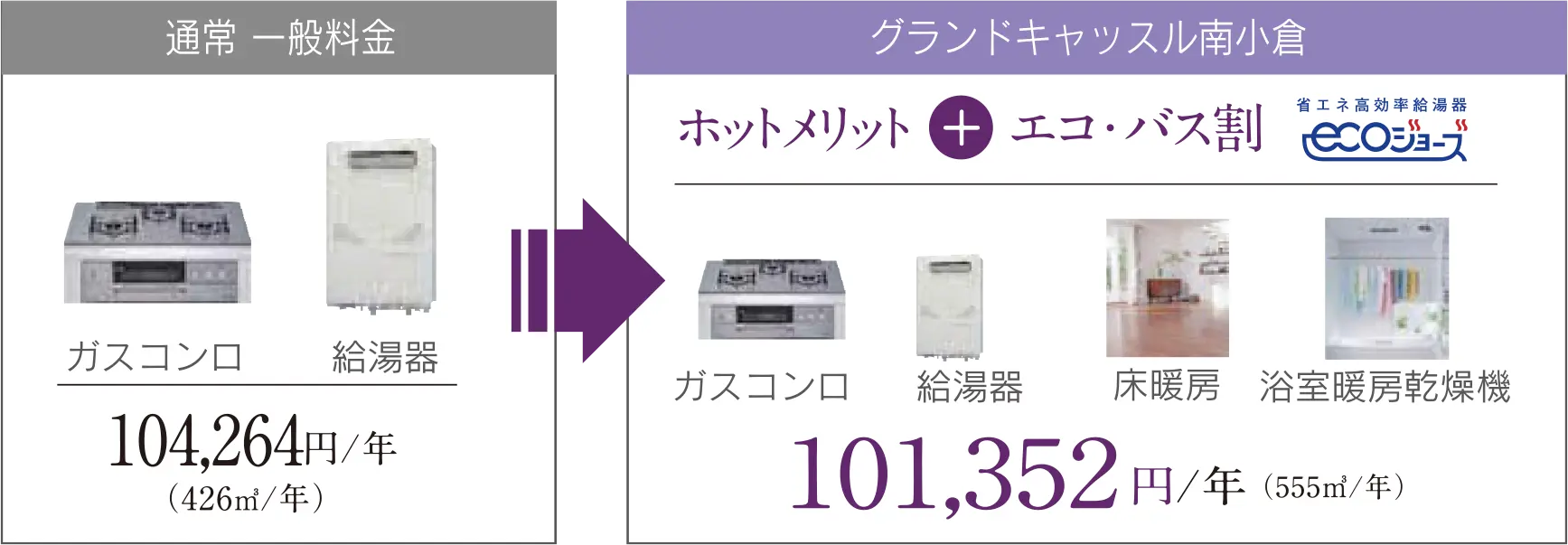エコジョーズとガス浴室暖房乾燥機を利用することでさらに「エコ・バス割」が適用されます。