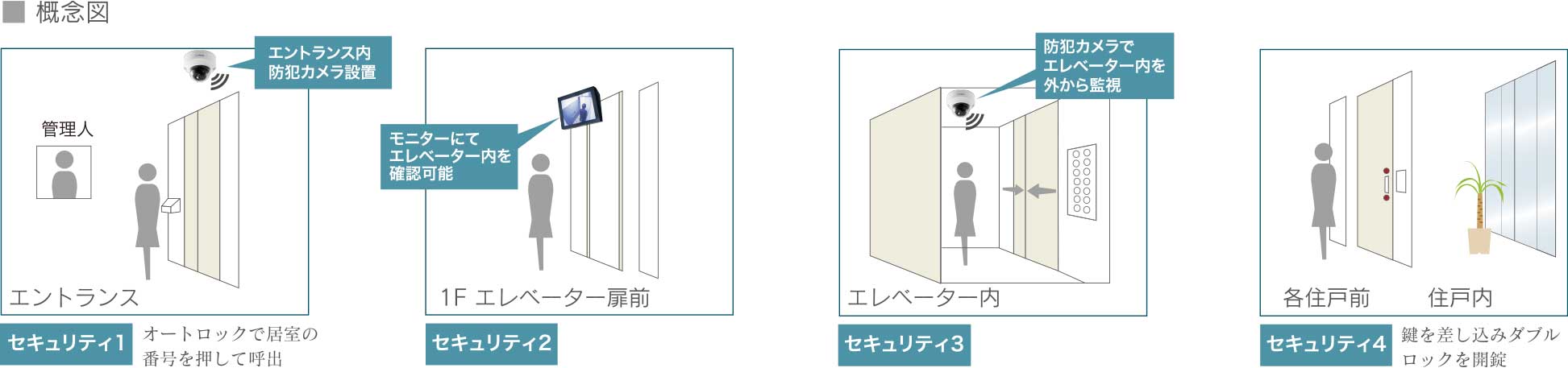 いたずらや犯罪を抑止するために、駐車場、エントランスホール、エレベーターなどに監視カメラを設置。1階エントランスにあるモニターで確認できます。